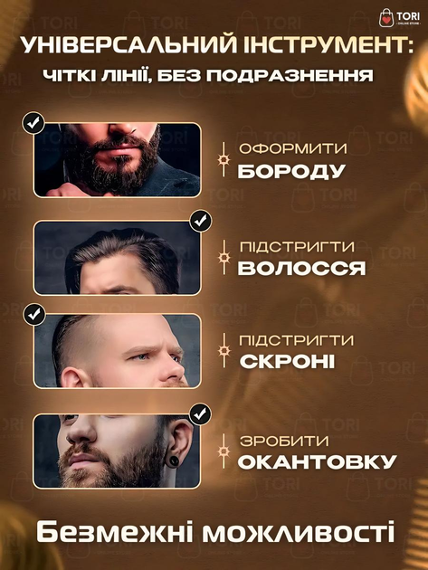 ✂️ Т-подібне лезо з нержавіючої сталі з точністю до 0,1 мм дає можливість робити чіткі контури, рівні лінії та ідеальну окантовку. А 4 насадки-гребені дозволяють регулювати довжину стрижки під будь-який стиль — від короткої бороди до точних ліній фейду.